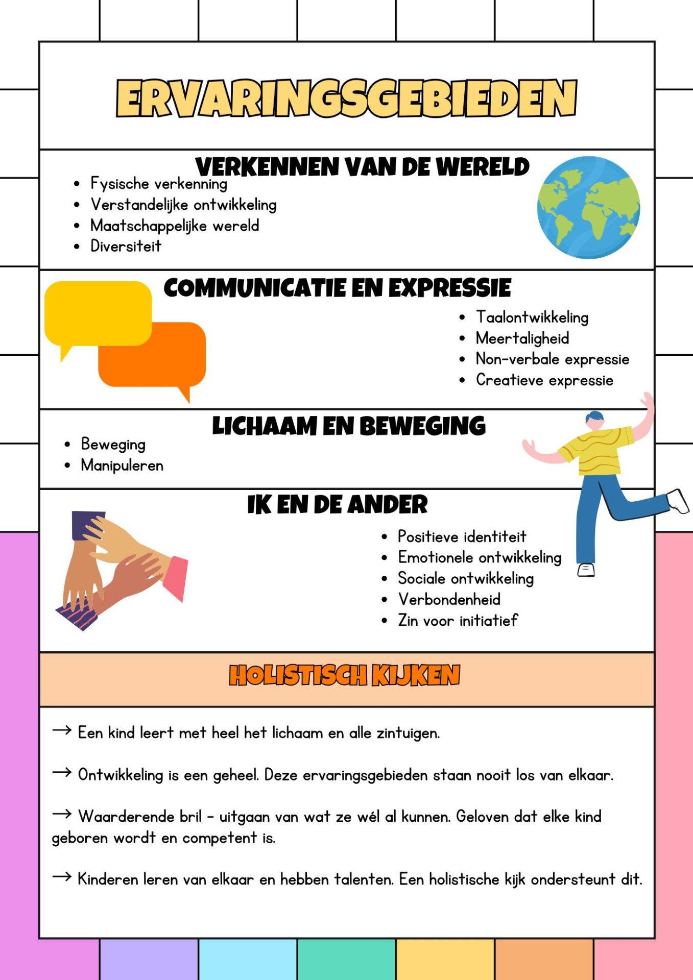We moedigen de kinderen aan om actief deel te nemen, te experimenteren en nieuwe inzichten op te doen door middel van échte ervaringen aan te bieden! Tijdens activiteiten spreken wij graag de verschillende ervaringsgebieden aan waarbij we rijke ervaringen aanbieden. De ervaringsgebieden;